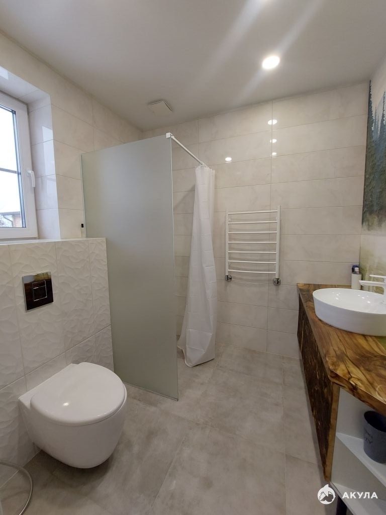 НА втором этаже: три комнаты, гардеробная, санузел. В комнатах стоят радиаторы, в санузле теплые полы.